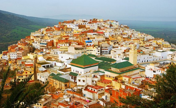 À 30 kilomètres de Meknès, se détachent soudain du paysage deux collines qui forment les premiers versants du massif Zehroun. Là, bien accrochée à ses cailloux, s’étale Moulay Idriss, ville sainte, empreinte de spiritualité, et dont les charmantes maisons blanches forment comme un rempart autour de la zaouïa située au fond du vallon et abritant le tombeau d’Idriss Ier, fondateur du ler état Islamique au Maroc à la fin du VIIème siècle premier sultan du Maroc.